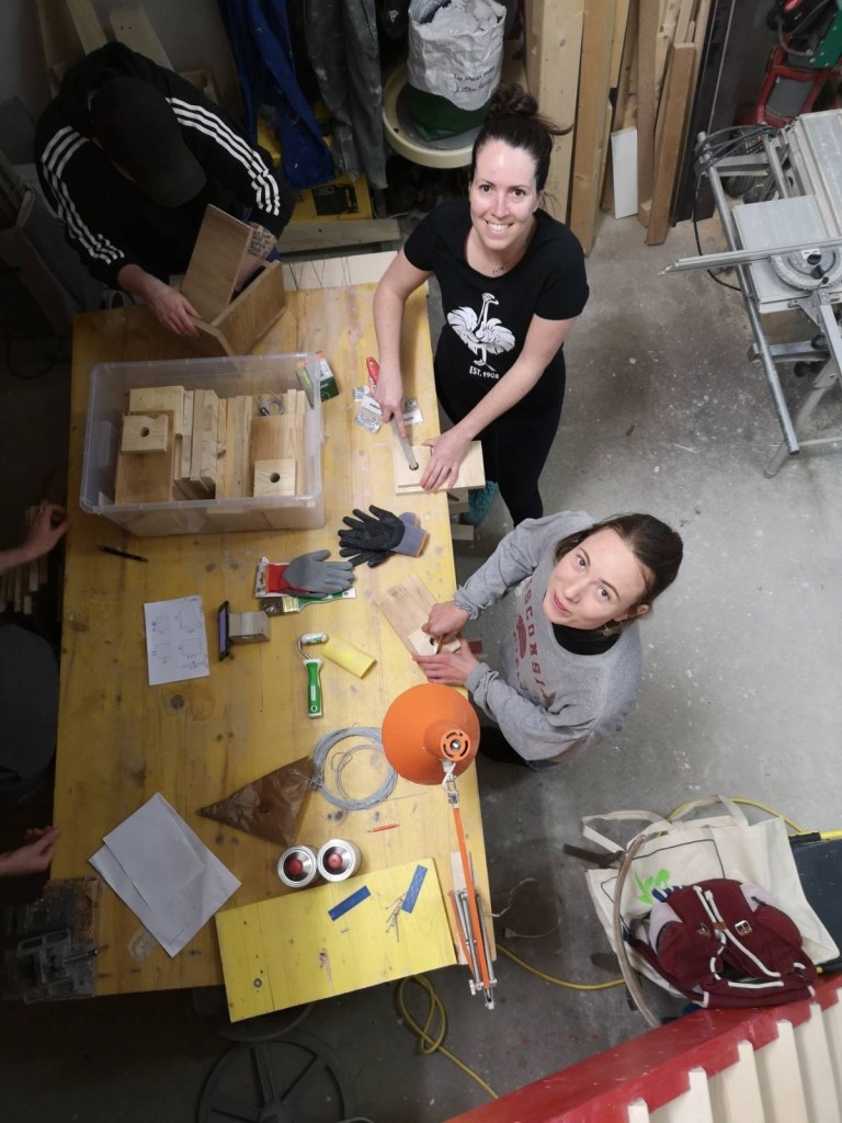 Bauworkshop im Kaorle – nach 6h Arbeit waren wir mit dem Bau unserer Nistkästen für Singvögel am Campus fertig.