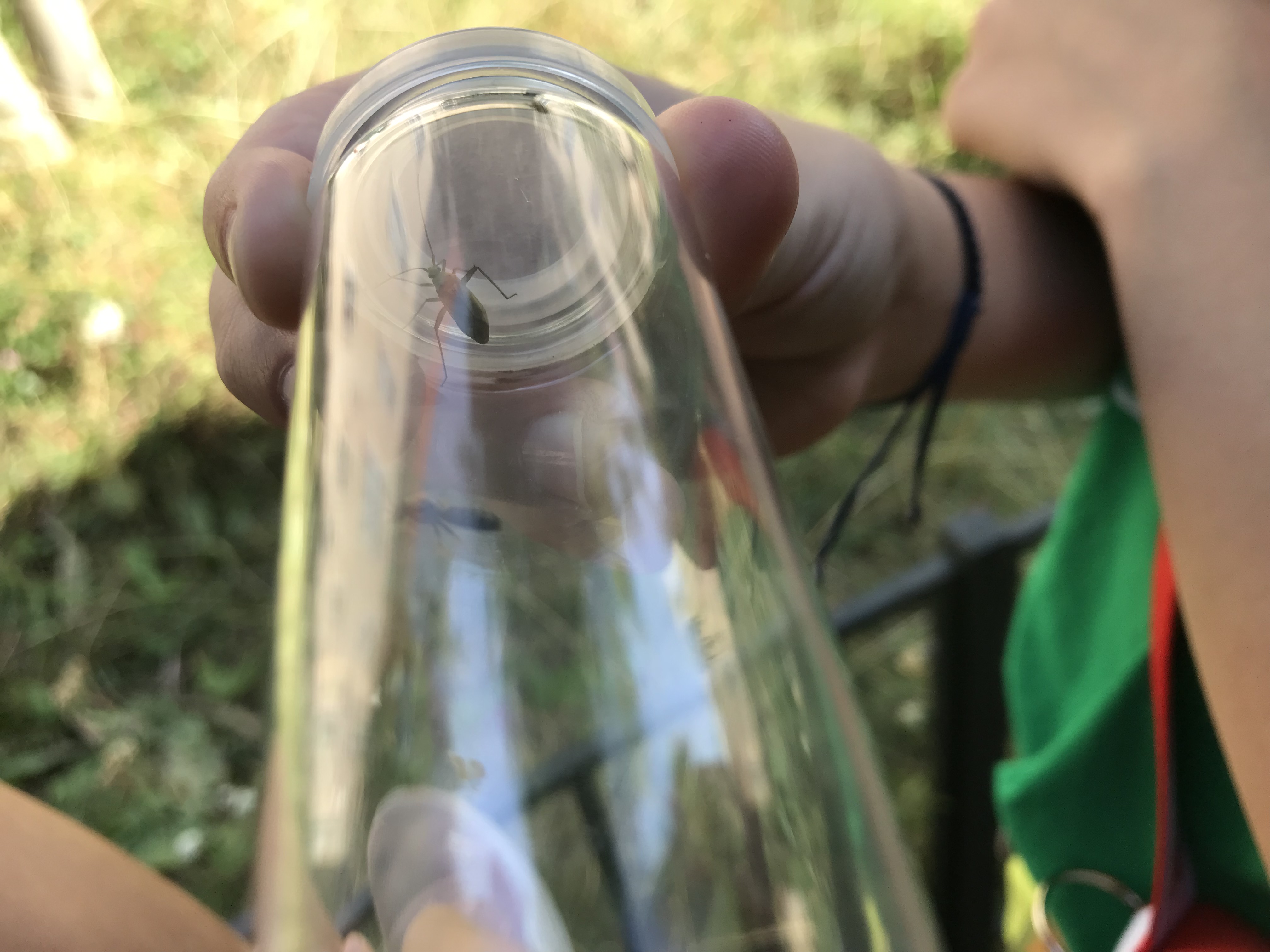Im Hof 2 wurde mit Kescher, Lupe und Probenglas die Insektenvielfalt der extensiv gemähten Blühfläche erkundet. Ameisen, Wildbienen, Wanzen und Heuschrecken wurden gefunden und erkannt.