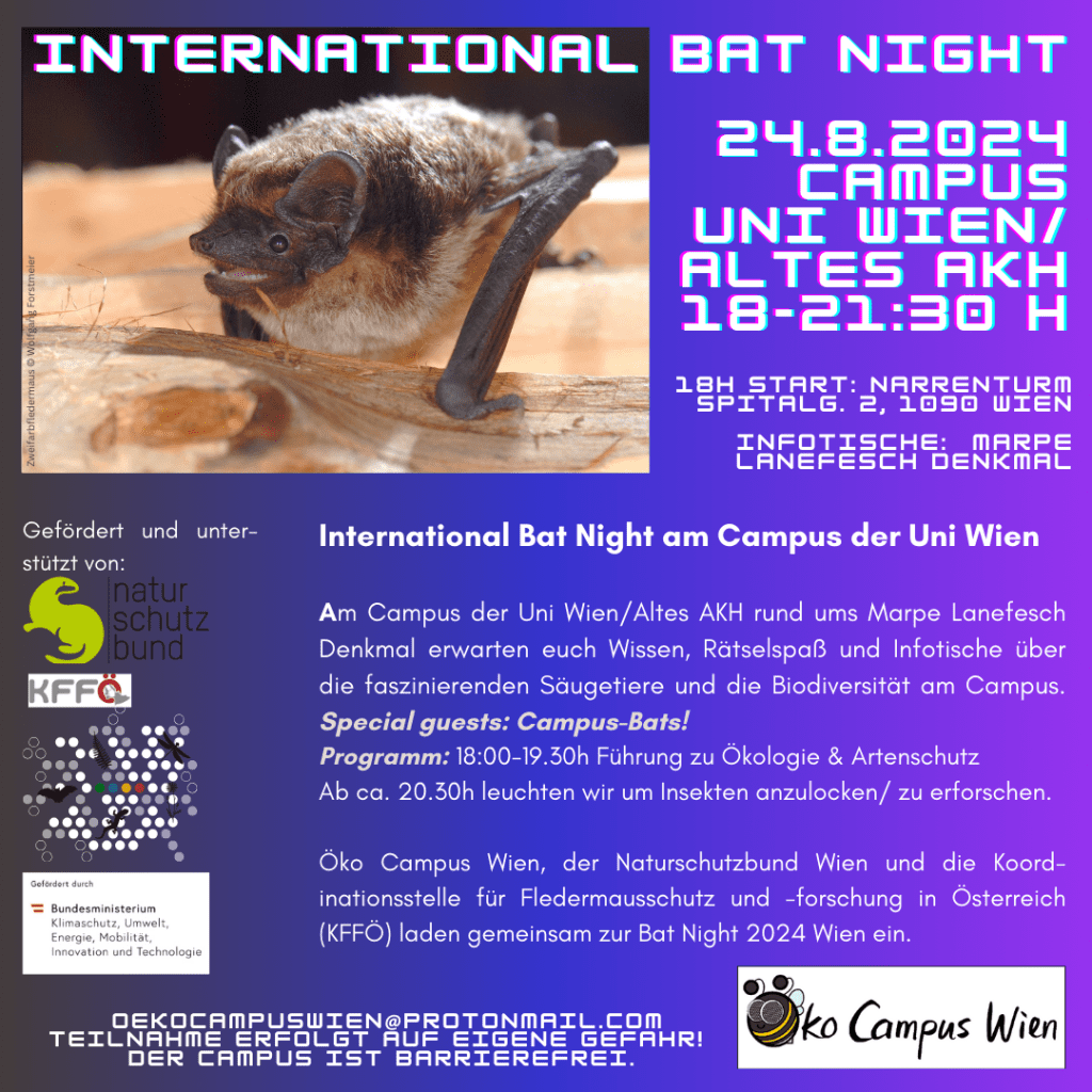 Heuer haben wir erstmals die International Bat Night am Campus genutzt um mit dem Naturschutzbund Wien sowie der Koordinationsstelle für Fledermausschutz und –forschung in Österreich (KFFÖ) Fledermäuse vielfältig zum Thema zu machen. Die streng geschützten Säugetiere sind am Campus sehr aktiv und wir verfolgen seit drei Jahren Ansätze zum Schutz der Tiere und setzen Projekte um zu Verbesserung der Lebensräume am Campus.