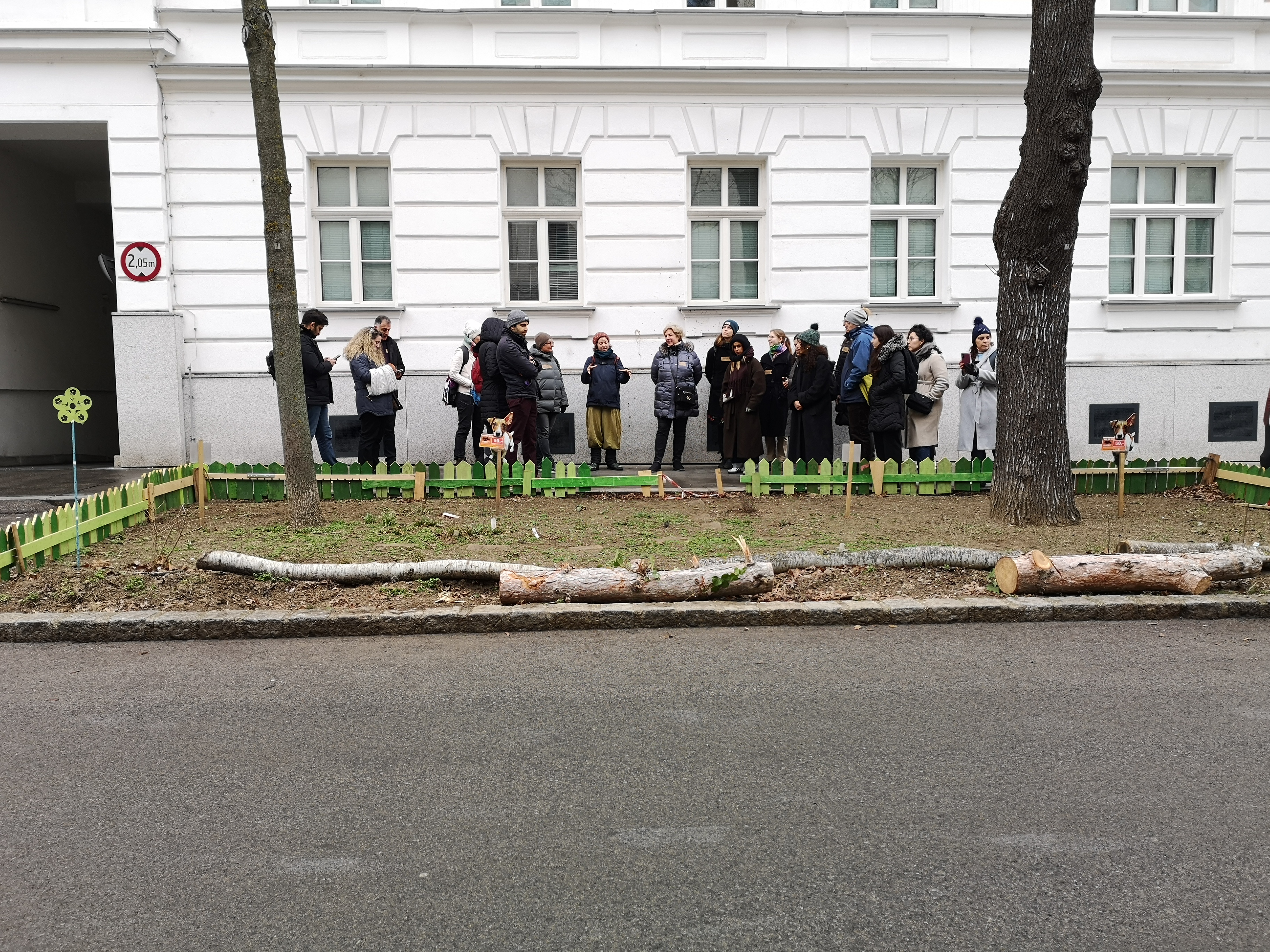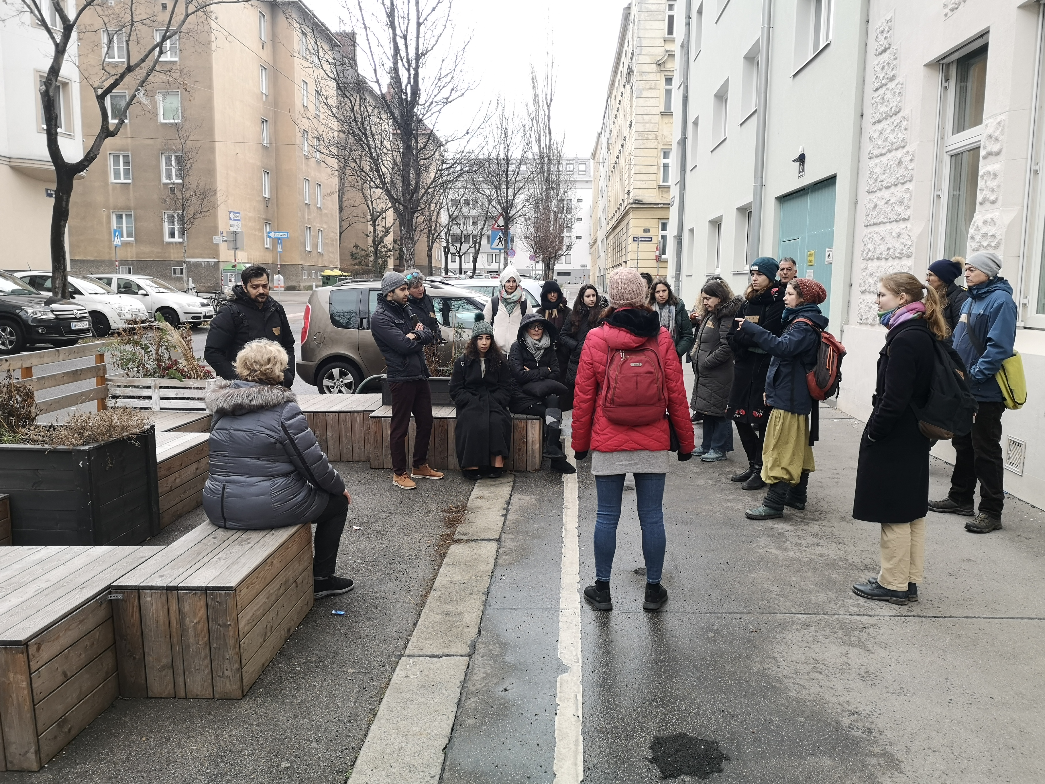 B) Biodiversitäts-Korridor aus Baumscheiben in Ottakring von Sarah Prehsler, die sie nachbarschaftlich und ehrenamtlich organisiert um das Nahumfeld ökologisch wertvoller zu gestalten. Wir besuchten auch das Parklett einer benachbarten Schule. Parklets sind Holzmöbel, die von der Stadt finanziert werden, um den öffentlichen Raum umzugestalten. Es gibt auch einige Anforderungen an die Bepflanzung, die man beachten muss.