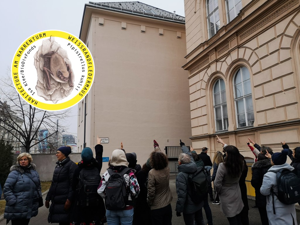 Campus-Tour zu Biodiversität und Kokreation: Am 1. Tag konnten wir den Campus der Uni Wien in der Spitalgasse 2 besichtigen und von den vielen Projekten, Erfolgen und Kooperationen am Campus sprechen und diese auch sichtbar machen. Auch das Nachhaltigkeitsbüro der Uni Wien war beim Campus-Rundgang mit Fokus auf gemeinsames Gestalten im Kontext von Biodiversität dabei, was uns sehr gefreut hat! Es ging um unsere Projekte wie das Projekt Aufblühen – Biodiverser Campus Uni Wien (1) Maßnahmen wie die Sensenmahd, unsere Citizen Science Veranstaltungen und Forschung, stehendes Totholz (Habitatbaum), naturnahe Wiesen und Mischhecken sowie selbstgebaute Nistkästen Singvögel am Campus. Auch das Projekt Urbane Biodiversität am Narrenturm – Habitecture für Fledermäuse und Mauersegler (2) und die vielen Ersatzquartiere für Fledermäuse (13 Kästen) und Mauersegler (15 Kästen) konnten wir besuchen – dabei ist dieses Bild entstanden: