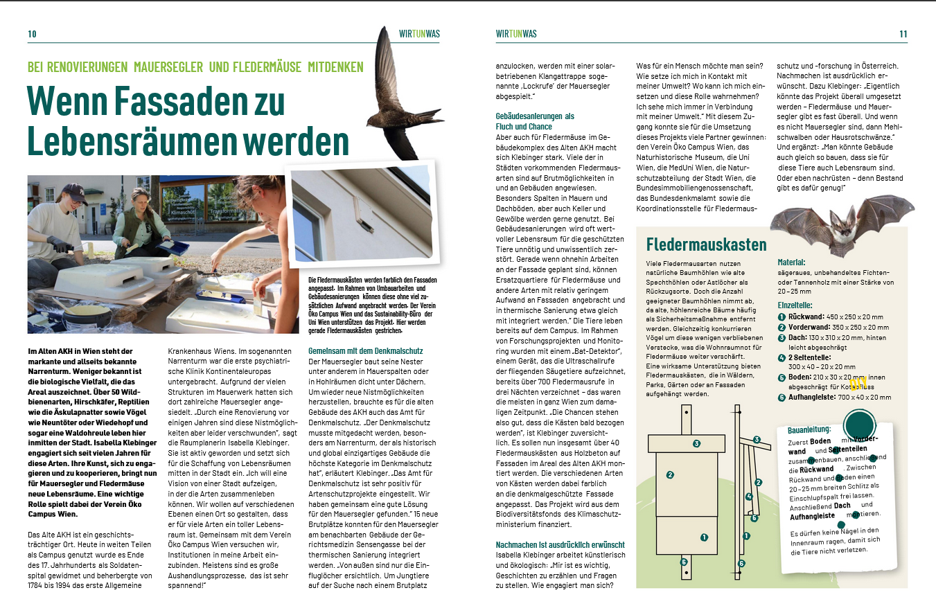 Ihr findet einen Projektbericht auf der Seite 10 im Magazin WIR TUN WAS mit Infos zum Projekt und Habitatarchitektur und Artenschutz an Gebäuden am Campus Altes AKH: