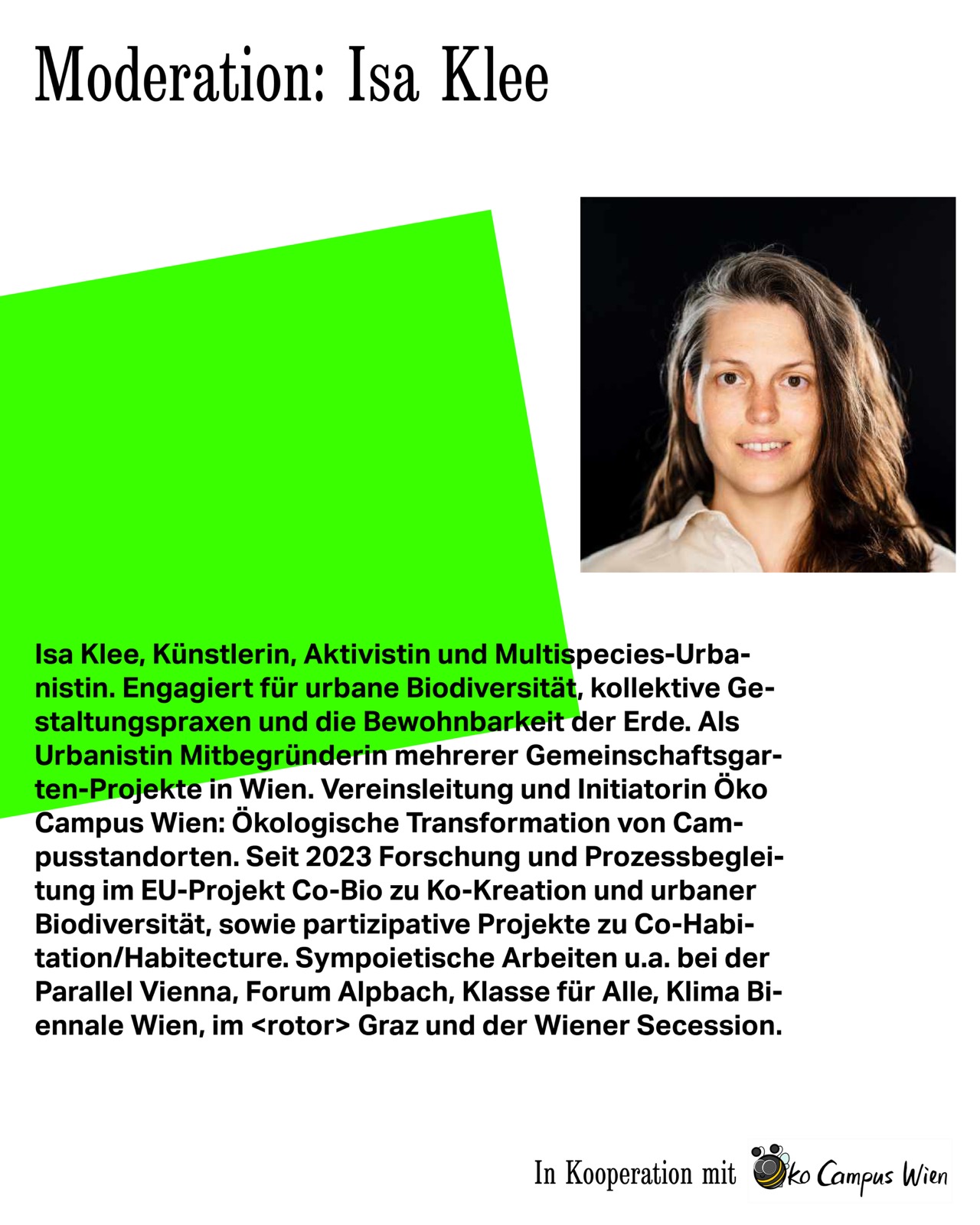 Der Abend beleuchtet politische und soziale Teilhabe ebenso wie künstlerische Strategien und nachhaltige Formen ko-kreativer Stadtentwicklung. Ziel ist es, Perspektiven aus unterschied-lichen Disziplinen zusammenzuführen und den Diskurs über demokratische Gestaltung von Lebensräumen zu vertiefen. Die Veranstaltung findet in Kooperation mit Depot – Kunst und Dikurs und Öko Campus Wien statt.